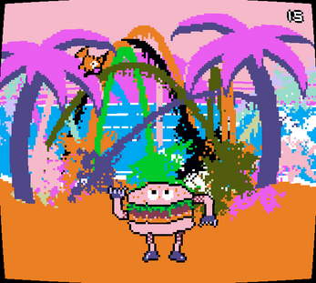 Step into the squishy and spongey shoes of an ambulant hamburger! Create art by violently repelling fish with your soft buns while dancing to cyber-yokelcore, and take a selfie at the beach with your beautiful artwork!